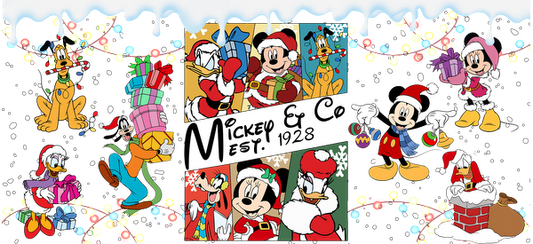 Celebrate the festive spirit with Mickey and friends, all dressed in Santa hats and surrounded by colorful gifts and decorations!UV Transfers heat press transfers