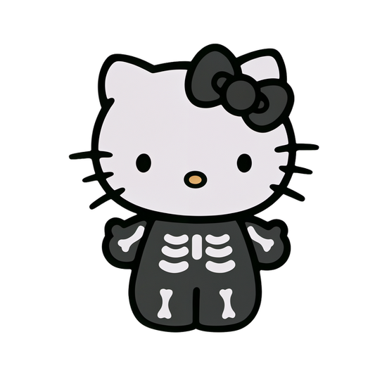 ¡Conoce a Hello Kitty con un lindo disfraz de esqueleto, que incluye un lazo negro, perfecto para darle un toque divertido a Halloween! Transferencias DTF