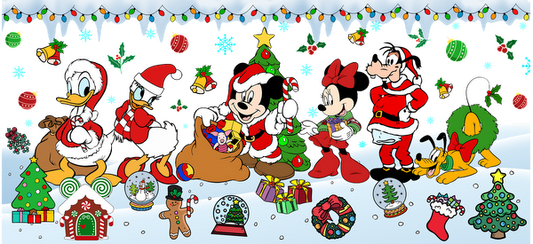 A festive Disney scene featuring beloved characters in Santa costumes, surrounded by Christmas decorations and cheerful winter elements.UV Transfersdtf regular iron