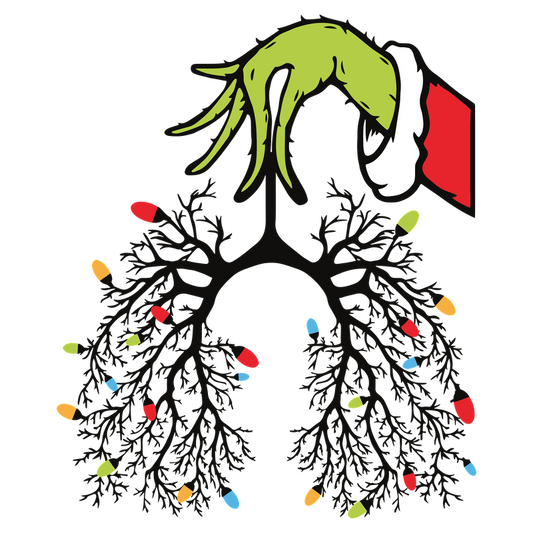 A whimsical illustration featuring the Grinch's hand adorned with a Santa hat, playfully hanging Christmas lights from tree-like branches.DTF Transfers dtf prints