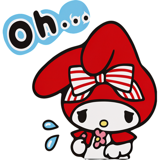 Un simpático personaje que lleva un sombrero rojo con un gran lazo, que parece triste y dice "Oh..." con una lágrima.Transferencias DTF