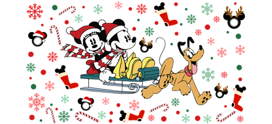 Mickey and Minnie Mouse, dressed in festive Santa hats, joyfully ride a sleigh alongside Pluto amidst a cheerful holiday backdrop.UV Transfers dtf transfers