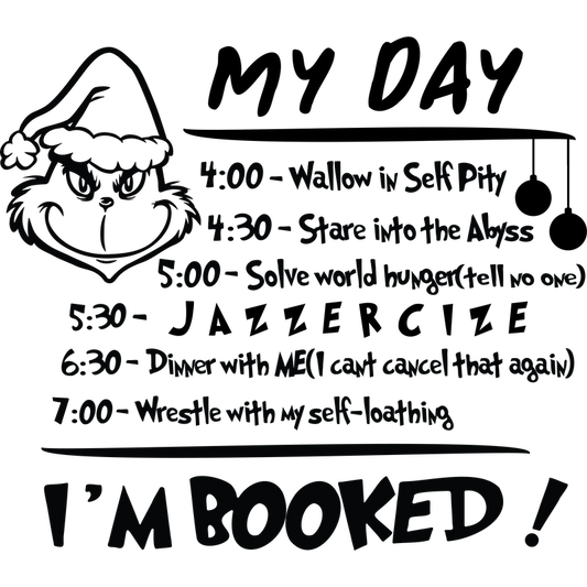 A whimsical schedule featuring a Grinch-like character with lighthearted activities planned throughout the evening, clearly marked as "I'M BOOKED!"DTF Transfers heat press transfersdtf regular iron