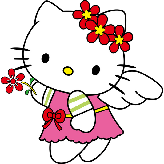 This charming illustration features Hello Kitty as a whimsical angel, adorned in a pink dress with floral accents and wings.DTF Transfers