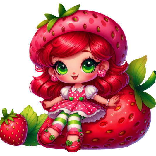 Adorable strawberry-themed character with vibrant red hair, green eyes, and playful attire, sitting cheerfully on a large strawberry.DTF Transfers