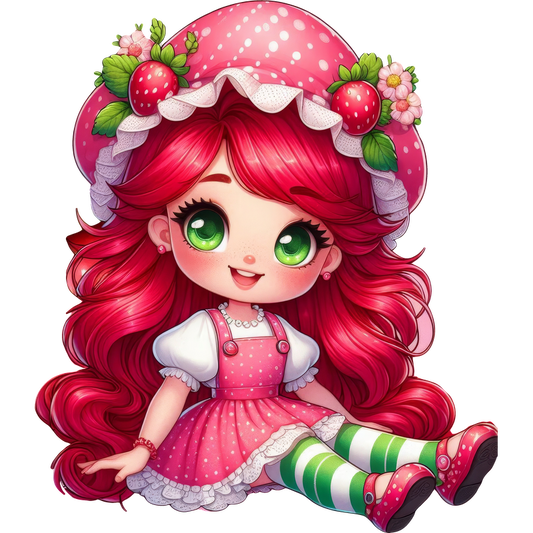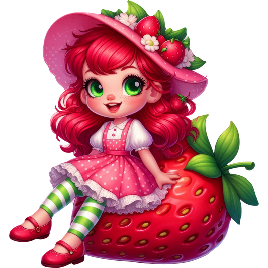 Meet a cute, strawberry-themed character with vibrant red hair, a sweet hat, and adorable striped stockings, sitting on a giant strawberry!DTF Transfers