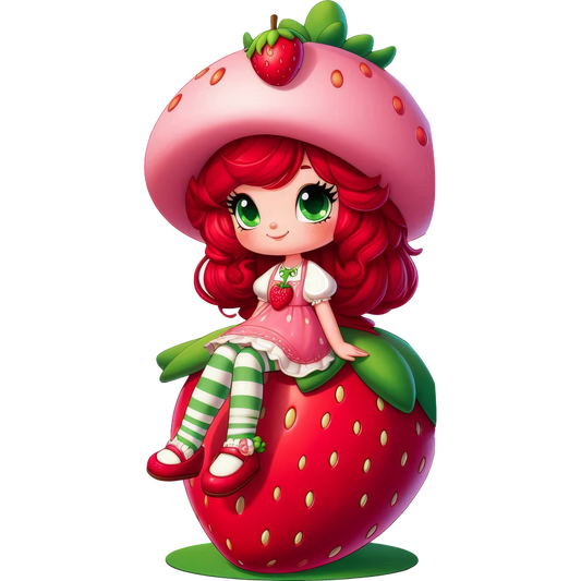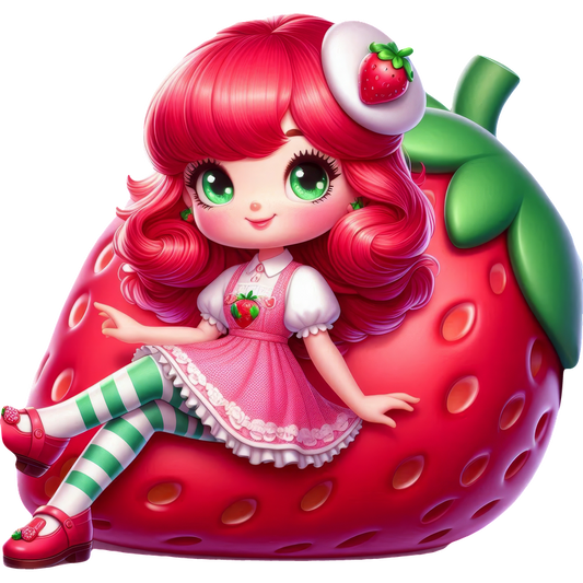 Meet a charming strawberry-themed character with vibrant pink hair, big green eyes, and a playful outfit, sitting on a giant strawberry!DTF Transfers