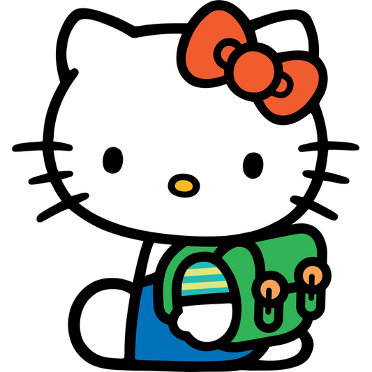 Hello Kitty is dressed in a cute outfit with a vibrant orange bow and is carrying a colorful green backpack.DTF Transfers