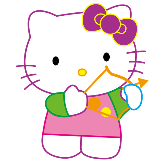 Meet Hello Kitty in a vibrant outfit with bright colors and a playful design, ready for fun adventures!DTF Transfers
