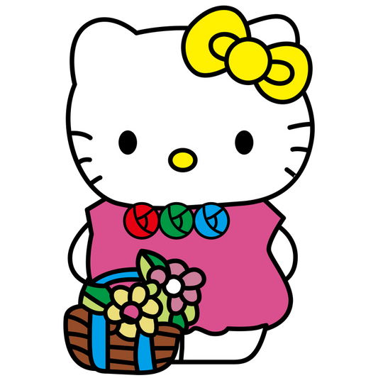 Meet Hello Kitty, wearing a cute pink dress adorned with colorful candies, and holding a basket of vibrant flowers!DTF Transfers