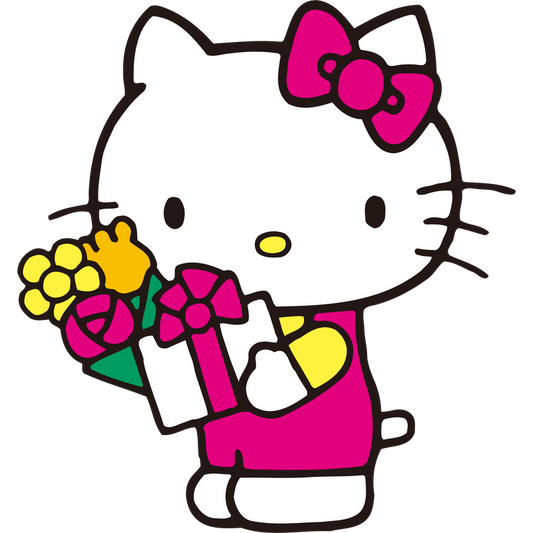 Hello Kitty is adorably holding a bouquet of flowers and a gift box, dressed in a pink outfit and matching bow.DTF Transfers