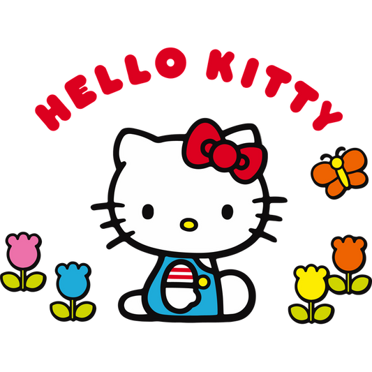Join Hello Kitty in a whimsical garden, surrounded by colorful flowers and a cheerful butterfly, radiating cuteness and joy!DTF Transfers