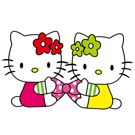 Precio habitual A partir de £0.75 GBPPrecio habitualPrecio unitario / por£2.40 GBPPrecio de oferta A partir de £0.75 GBPTwo adorable Hello Kitty characters, dressed in pink and yellow with colorful flower accents, are holding a pink bow together.DTF Transfers