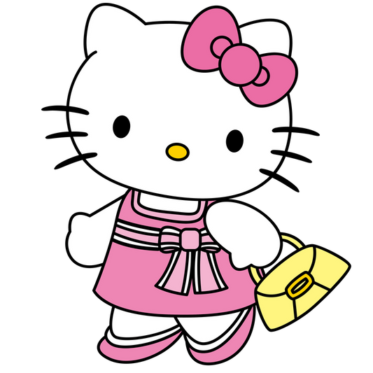 Meet Hello Kitty, a cute cartoon character dressed in a pink dress with a bow, carrying a yellow handbag!DTF Transfers