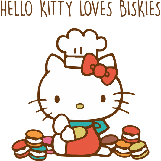 Hello Kitty, dressed as a chef with a playful apron and chef hat, joyfully holds a biscuit while surrounded by colorful treats.DTF Transfers