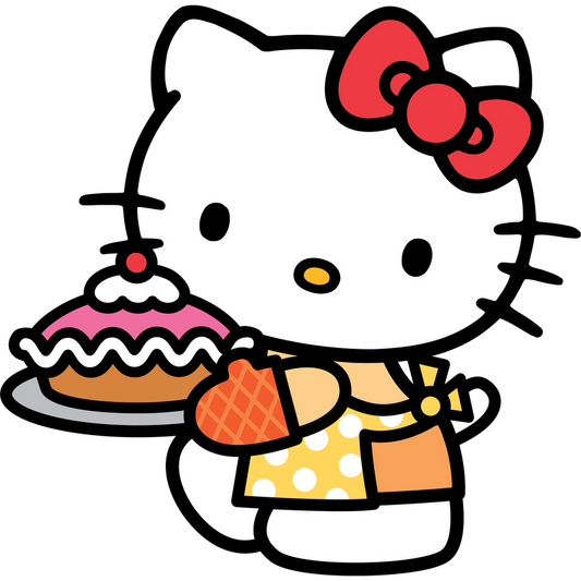 Hello Kitty is adorably showcasing a colorful cake on a platter while wearing a polka dot apron and a big red bow!DTF Transfers