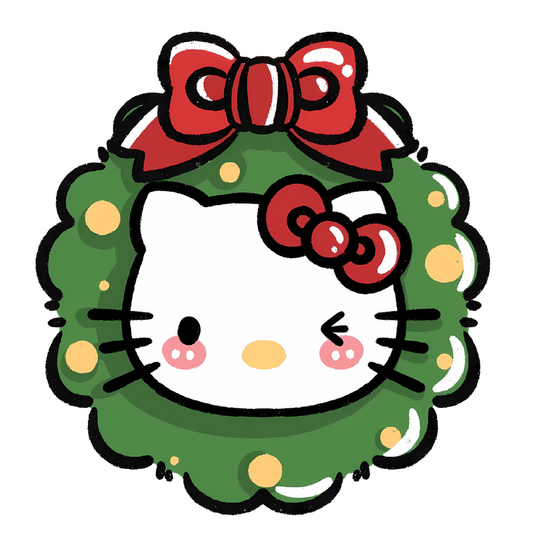 This adorable illustration features Hello Kitty peeking through a festive wreath adorned with bright red bows and cheerful ornaments.DTF Transfers