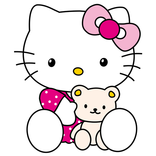 Adorable Hello Kitty cuddles a cute bear, showcasing her signature style with a pink polka dot dress and bow.DTF Transfers