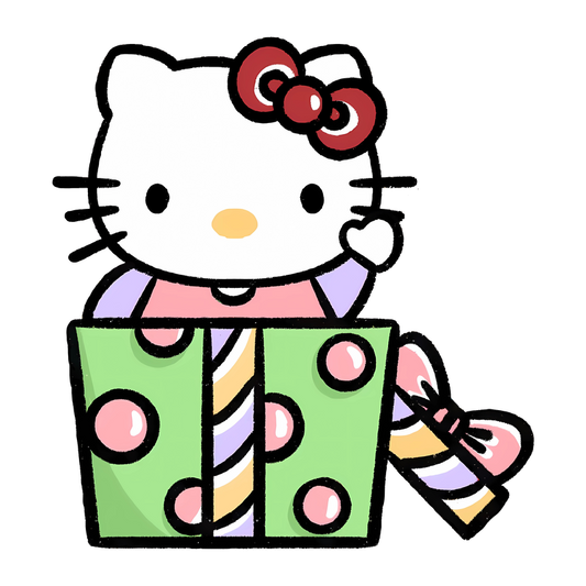Hello Kitty peeks out from a festive, green gift box, adorned with colorful polka dots and a cute pink bow.DTF Transfers