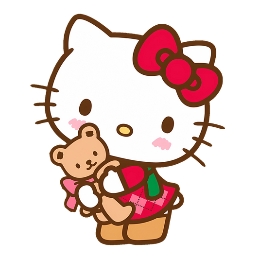 Precio habitual A partir de £0.75 GBPPrecio habitualPrecio unitario / por£2.40 GBPPrecio de oferta A partir de £0.75 GBPCute Hello Kitty holds a teddy bear, adorned with a vibrant red bow and dressed in a charming plaid outfit.DTF Transfers