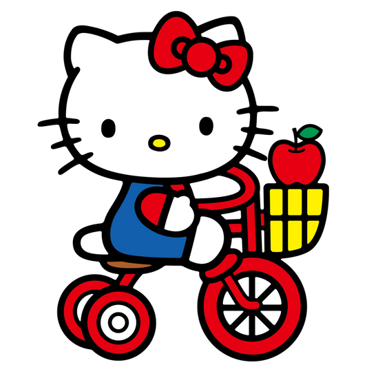 Hello Kitty rides a vibrant red tricycle, wearing a blue dress with a heart, complete with a basket holding an apple.DTF Transfers