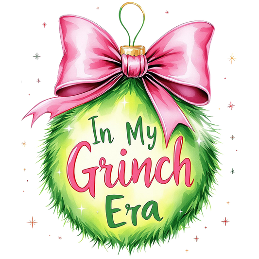 Festive and playful, this vibrant green ornament features the phrase "In My Grinch Era," topped with a pink bow.DTF Transfers