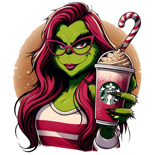 Un personaje elegante, de piel verde y cabello rosa vibrante, que usa anteojos y sostiene una bebida festiva de Starbucks cubierta con crema batida. Transferencias DTF