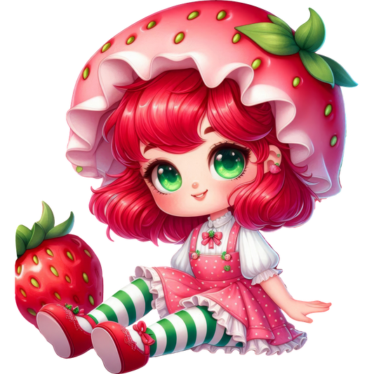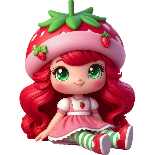 Meet the adorable strawberry-themed doll with vibrant red hair, big green eyes, and a cute strawberry hat and dress!DTF Transfers