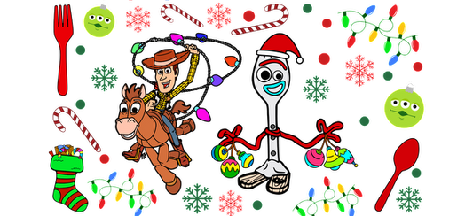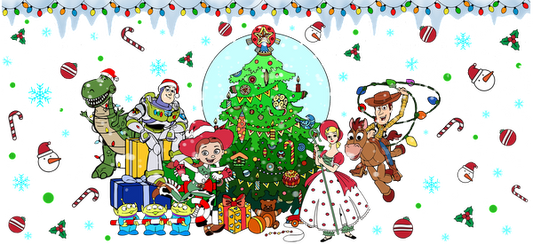 A festive illustration featuring beloved Toy Story characters around a decorated Christmas tree, surrounded by snowflakes and cheerful holiday elements.UV Transfersdtf regular iron