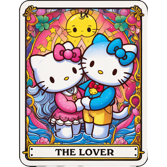 Esta vibrante ilustración presenta a Hello Kitty y a su amiga como "El Amante", rodeadas de diseños coloridos y extravagantes. Transferencias DTF