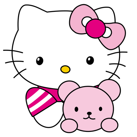 This adorable image features Hello Kitty, styled with a pink bow, playfully holding a cute pink teddy bear.DTF Transfers