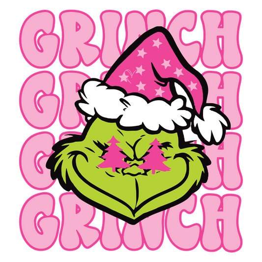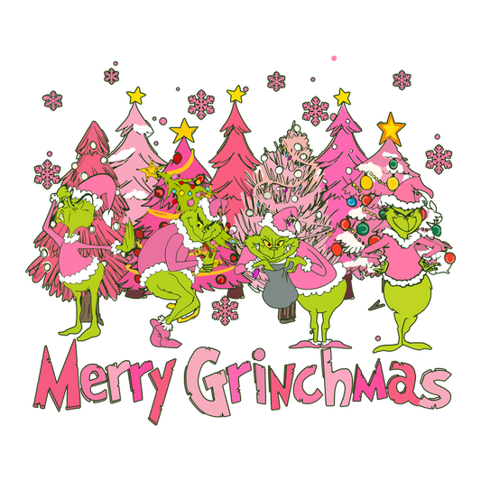 Celebrate the holiday spirit with whimsical Grinch characters amidst vibrant pink Christmas trees, cheerfully wishing "Merry Grinchmas!"DTF Transfers dtf transfers dtf transfers