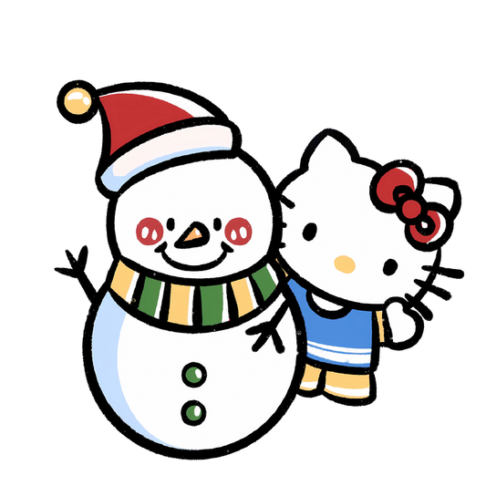 Hello Kitty joyfully poses with a cheerful snowman, both embracing the festive spirit with colorful accessories and warm smiles.DTF Transfers