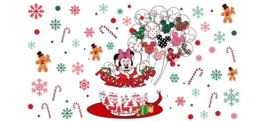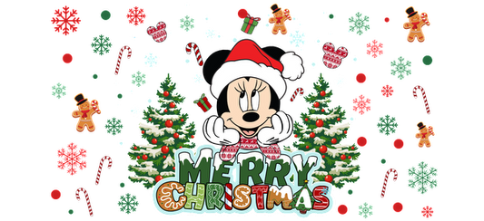 Celebrate the festive spirit with this cheerful "Merry Christmas" design featuring Minnie Mouse, decorated trees, and holiday treats!UV Transfersdtf regular iron