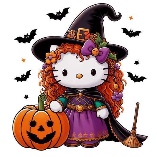 Hello Kitty is dressed as a witch, complete with a black hat, purple gown, and a pumpkin with a spooky face.DTF Transfers heat press transfers