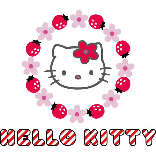 Bright and cheerful Hello Kitty logo surrounded by flowers and strawberries, perfect for fans of this iconic character!DTF Transfers