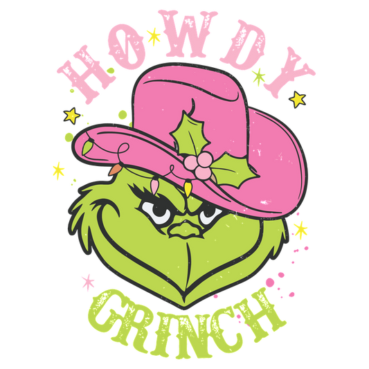A quirky design featuring the Grinch in a bright pink cowboy hat, complete with festive holly and playful lettering.DTF Transfersdtf regular iron