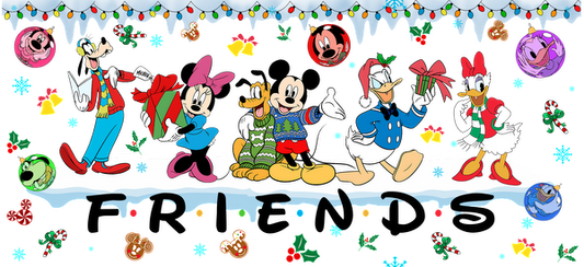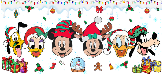 A festive gathering of beloved Disney characters, including Mickey, Minnie, Donald, and others, celebrating the holiday season with cheerful gifts and decorations.UV Transfers dtf transfers