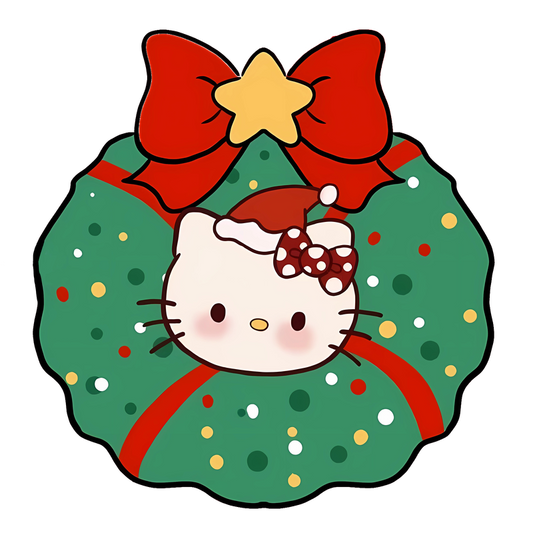Celebrate the holidays with this adorable Hello Kitty wreath, featuring a festive red bow, colorful ornaments, and a Santa hat.DTF Transfers