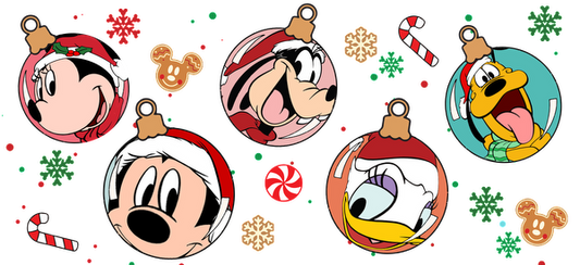 Celebrate the holidays with this fun set of ornament designs featuring Mickey, Minnie, Pluto, Goofy, and Daisy in festive cheer!UV Transfers dtf prints