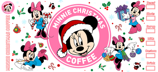 Festively designed "Minnie Christmas Coffee" banner featuring Minnie Mouse in holiday attire surrounded by gifts and seasonal icons.UV Transfers heat press transfers