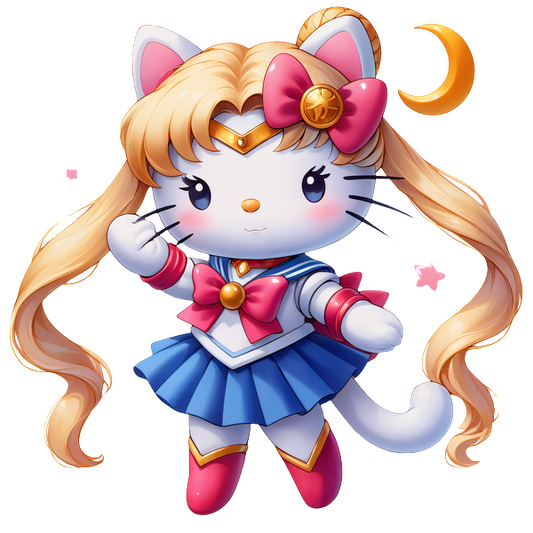 A charming cat character dressed as a sailor warrior, featuring a blue skirt, red bow, and long blonde hair.DTF Transfers heat press transfers