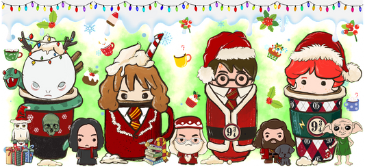 A whimsical holiday illustration featuring adorable chibi characters in festive mugs, celebrating the season with cheerful decorations and iconic elements.UV Transfers dtf prints