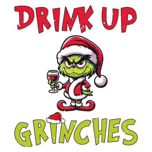 Celebrate the holiday season with this playful Grinch graphic, complete with a festive drink and a cheeky "Drink Up Grinches" message!DTF Transfers heat press transfers