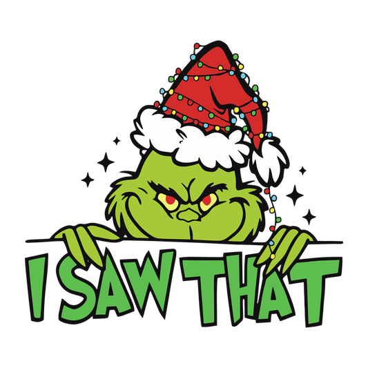 The Grinch peeks out with a festive hat, playfully declaring, "I SAW THAT!"—perfect for the holiday season!DTF Transfers