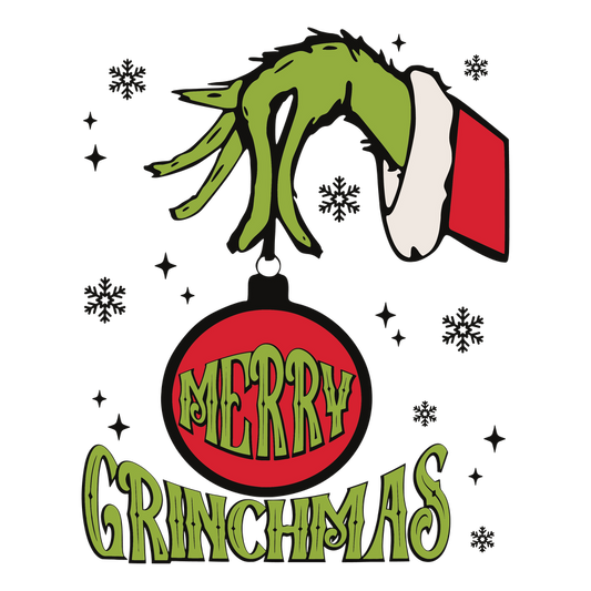 Celebrate the holiday spirit with this whimsical "Merry Grinchmas" design featuring a green hand holding a festive ornament!DTF Transfers dtf prints