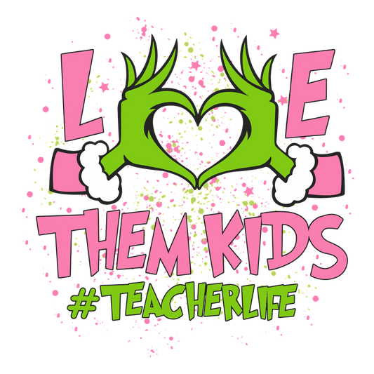 A vibrant and playful graphic celebrating teachers with the phrase "Love Them Kids" and a heart shape formed by hands.DTF Transfers dtf prints