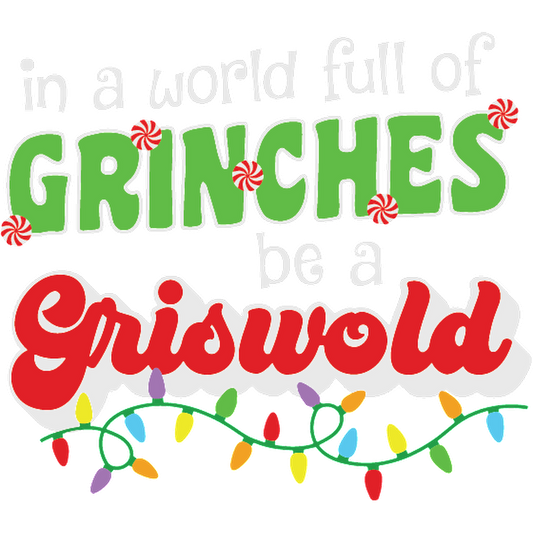 Celebrate the holidays with this fun, colorful quote: "In a world full of Grinches, be a Griswold," surrounded by festive decorations.DTF Transfers heat press transfers heat press transfers