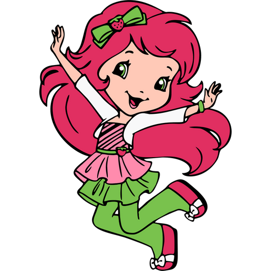 This cheerful character features vibrant pink hair, a playful outfit with a green and pink theme, and a cute strawberry bow!DTF Transfers