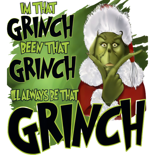 A whimsical illustration of the Grinch in a Santa outfit, pondering with a cheeky expression, surrounded by playful text.DTF Transfersdtf regular iron